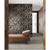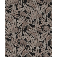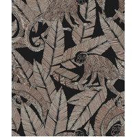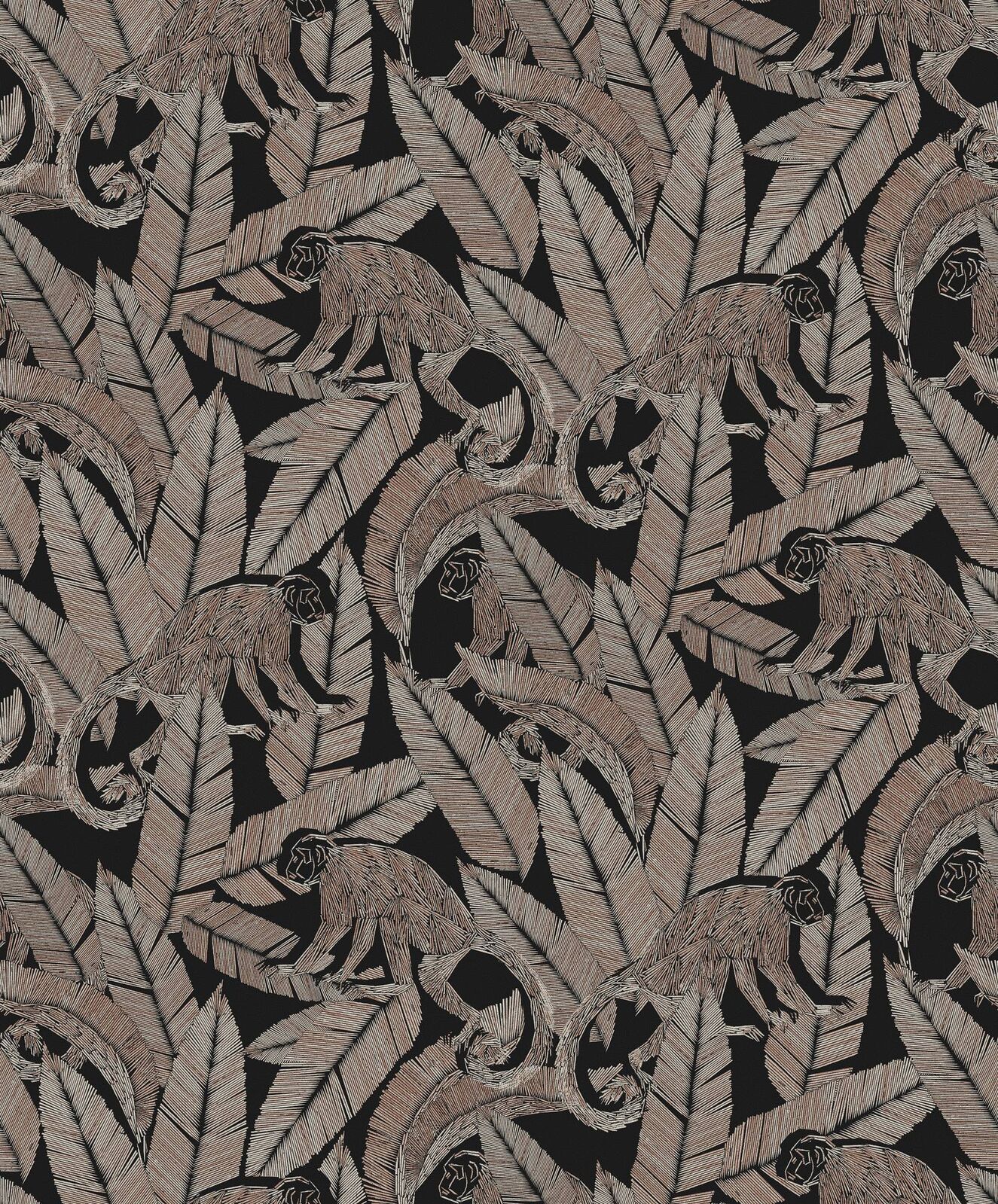 A design of playful monkeys amongst palm leaves with a rich etch-style formation. Monkey brings an exotic note to interiors with its tropical design and bold colourings. The Night colourway features a matte black base with monkey and palm details in neutral and metallic bronze shades.