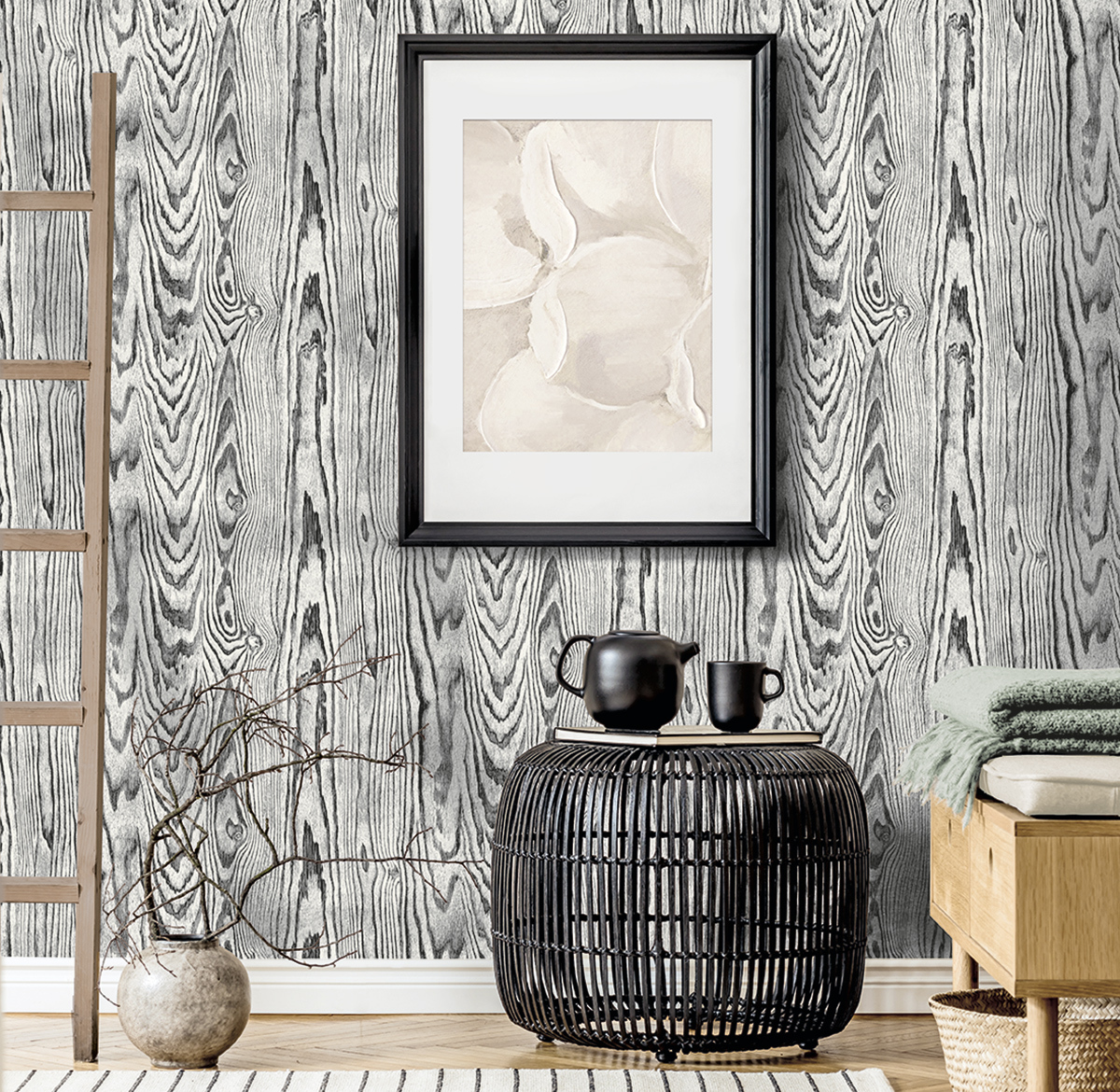 This faux woodgrain wallpaper pattern adds a unique visual rhythm to any wall surface. The Bold Woodgrain colourway features a soft grey base with a charcoal woodgrain look overtop.