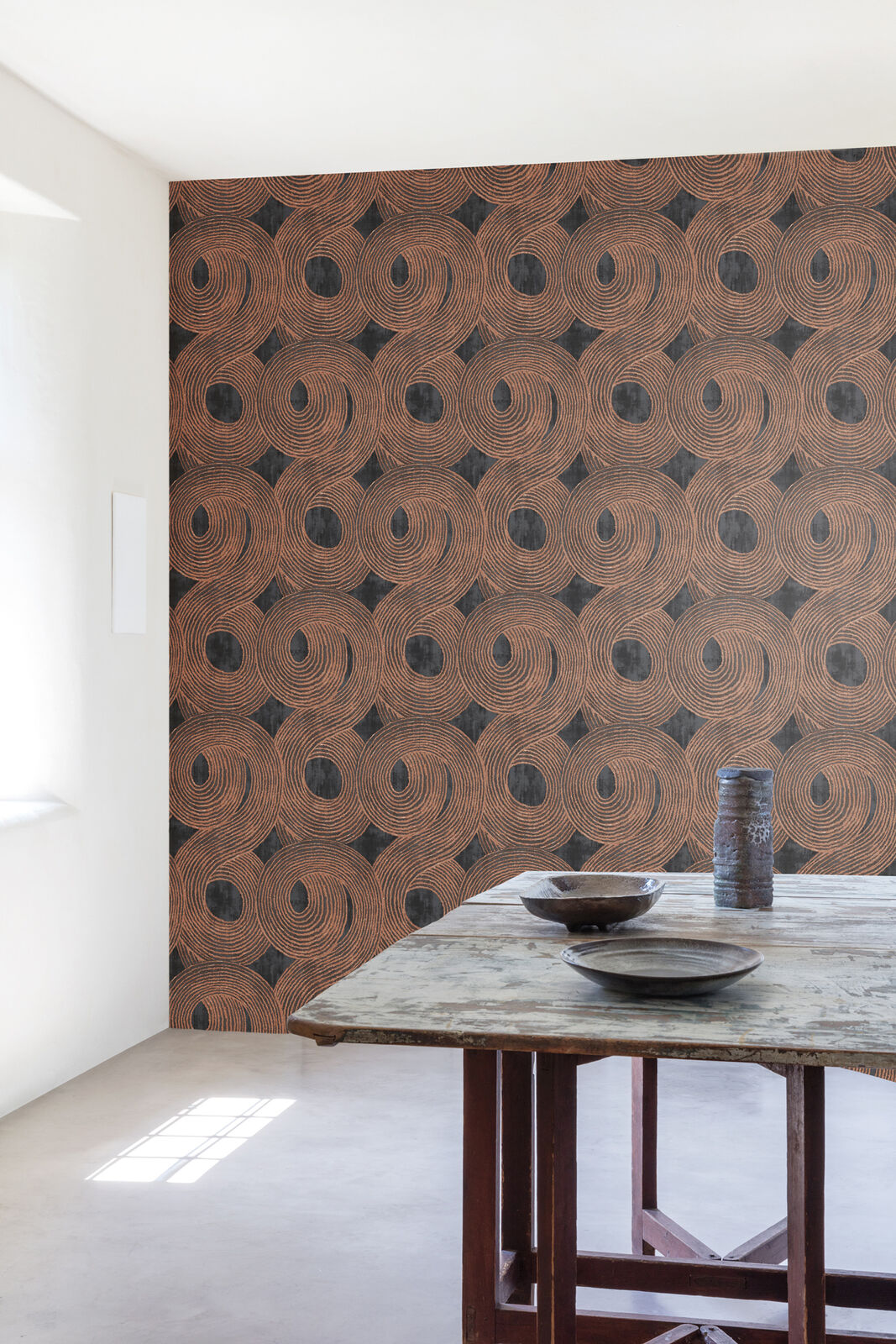 A contemporary design inspired by traditional tribal markings. Large brushstrokes swirl together with a slight texture creating dimension and depth. The Slate colourway features a washed charcoal base with swirl details in a rich metallic bronze shade.