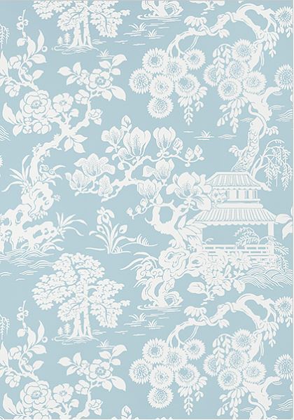 Oriental style garden scene,  soft blue background with white pattern.  The background has a fine faux grasscloth textured look. Vinyl wallpaper for easy cleaning and durability.