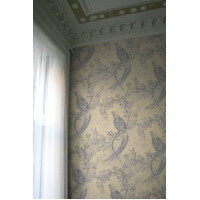 The Pheasant design is a Sustainable Forest wallpaper featuring an elegant toile-like pattern of birds and ferns.