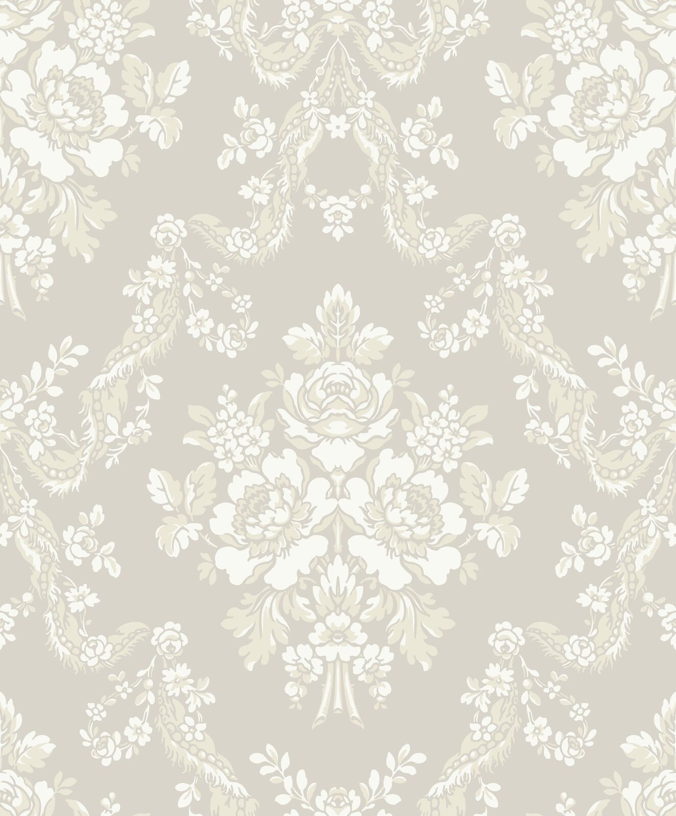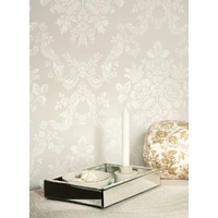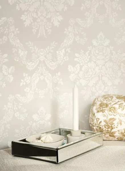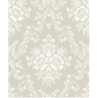 A companion to toile de Jouy, classic ornaments have long decorated castles and manor houses. Treat yourself to a regal decor with the baroque Pompadour: fruit baskets, plant garlands, and intertwining vines blossom on your walls. And did you know that the Marquise de Pompadour played a decisive role in the rise of toile de Jouy? The Pearl Grey colourway features a soft grey base with white and metallic silver damask elements.