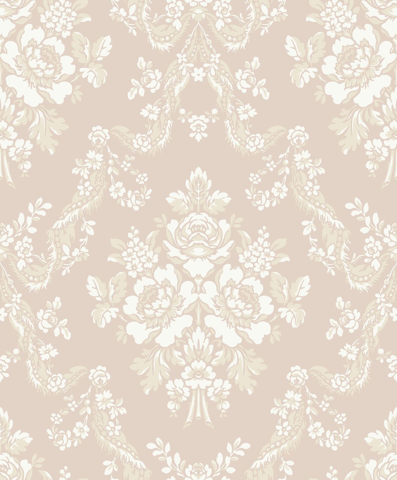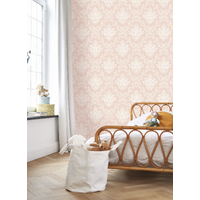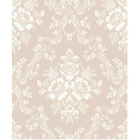 A companion to toile de Jouy, classic ornaments have long decorated castles and manor houses. Treat yourself to a regal decor with the baroque Pompadour: fruit baskets, plant garlands, and intertwining vines blossom on your walls. And did you know that the Marquise de Pompadour played a decisive role in the rise of toile de Jouy? The Powder Pink colourway features a soft pink base with white and metallic silver damask elements.