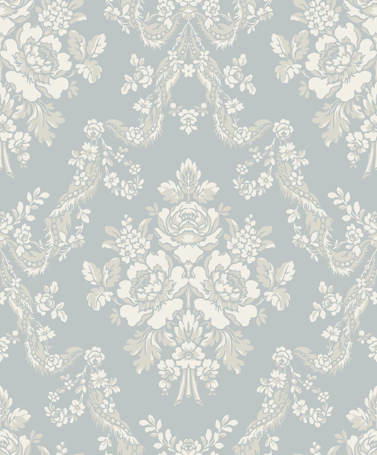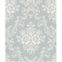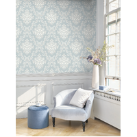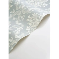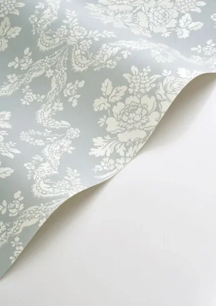 A companion to toile de Jouy, classic ornaments have long decorated castles and manor houses. Treat yourself to a regal decor with the baroque Pompadour: fruit baskets, plant garlands, and intertwining vines blossom on your walls. And did you know that the Marquise de Pompadour played a decisive role in the rise of toile de Jouy? The Soft Blue colourway features a powder blue base with white and metallic silver damask elements.
