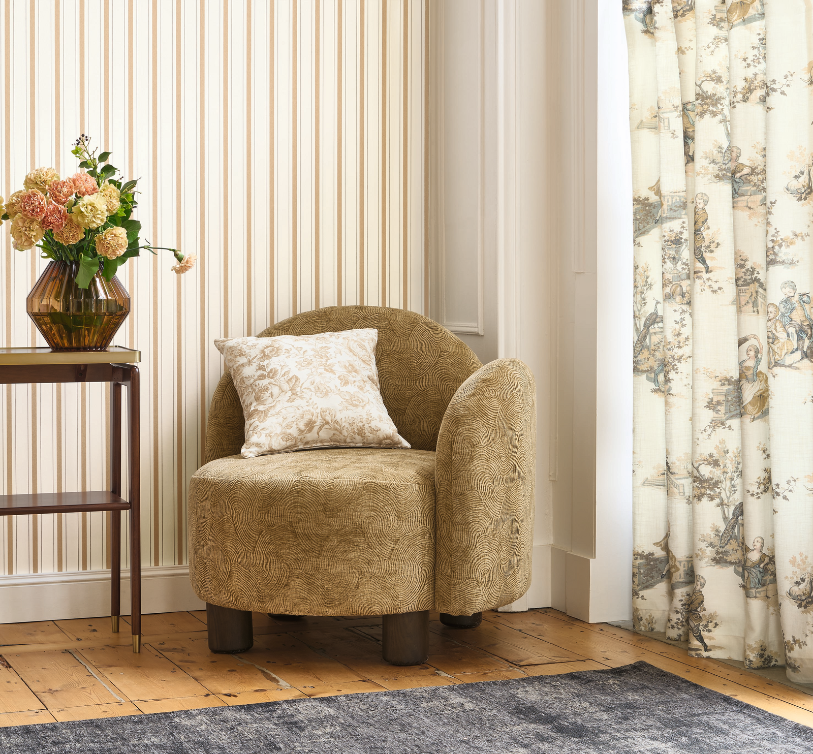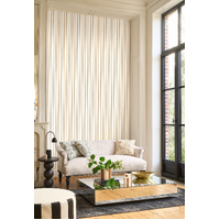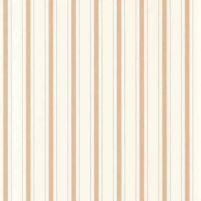 Complementary stripes Three stripes, two thin and one wide, in a soft camel colour: this geometric wallpaper is the perfect accompaniment to Jouy fabrics. The Camel colourway features a soft white base with warm beige stripes.