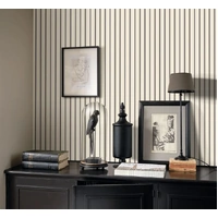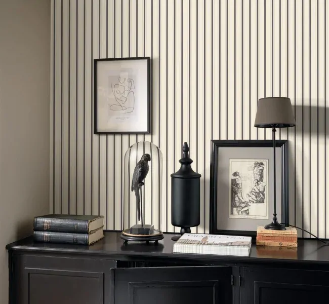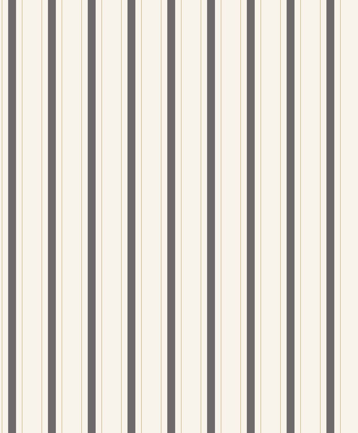 Complementary stripes Three stripes, two thin and one wide, in a soft camel colour: this geometric wallpaper is the perfect accompaniment to Jouy fabrics. The Charcoal colourway features a creamy white base with charcoal and thin gold stripes.