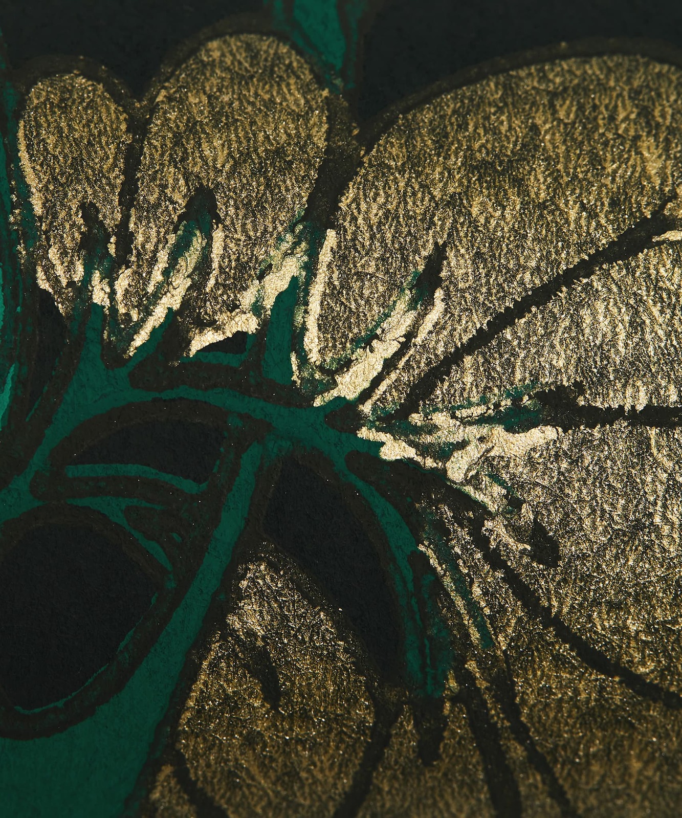 Reminiscent of the gentleman’s clubs of the Regency period, Regency Tulip is reimagined through bold tonal colour combinations into a striking sartorial design. Rich chalky grounds form the background for the boldly coloured tulip motifs, in beautiful matte and metallic pigments. Carefully selected to bring this design to life, the surface print technique allows rich reticulation of surface pigment, emulating traditional block printing effects. A stunning emerald green and metallic gold bring the elegance of Regency Tulip to a whole new level.