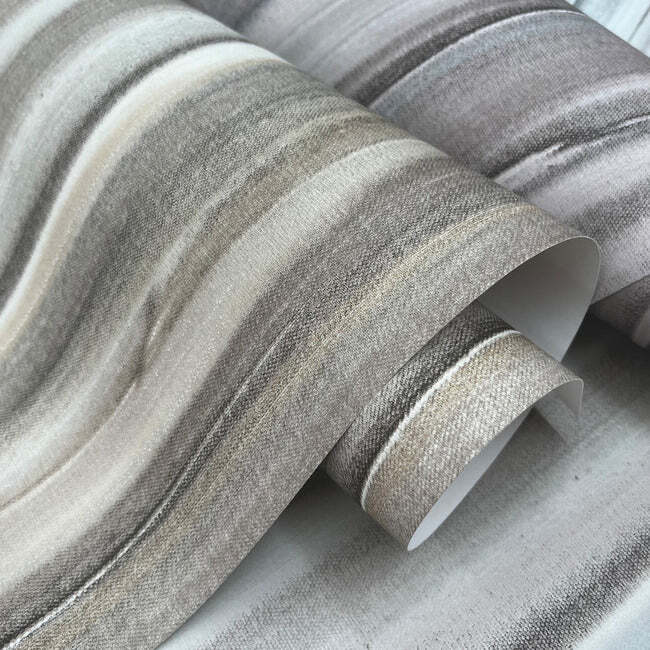 A textural canvas and horizontal wash of smoky hues lend the Sanctuary pattern a modern atmospheric mood. This design has a varying textural feel. The Smoky Blue colourway features hues of soft blue, grey, charcoal, and beige.