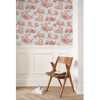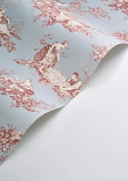 A pastoral scene revisited Fancy a toile de Jouy with a twist? Then Scène d'été is here to break the mould! Colourful backgrounds, modernised designs, contrasting patterns... The Garnet Red colourway features a soft washed blue base with deep red toile scenes.