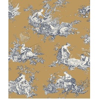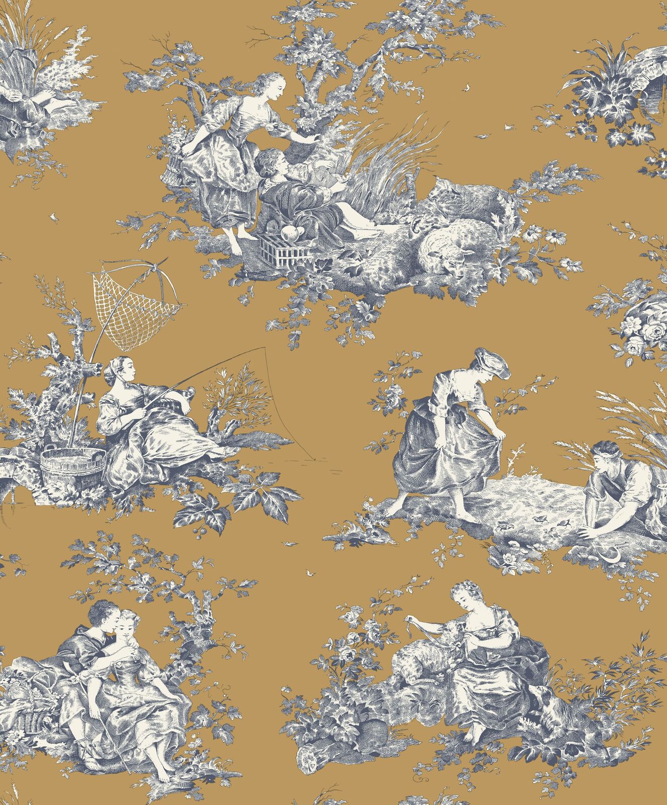 A pastoral scene revisited Fancy a toile de Jouy with a twist? Then Scène d'été is here to break the mould! Colourful backgrounds, modernised designs, contrasting patterns... The Ochre colourway features a rich beige ochre base with indigo and white toile scenes.