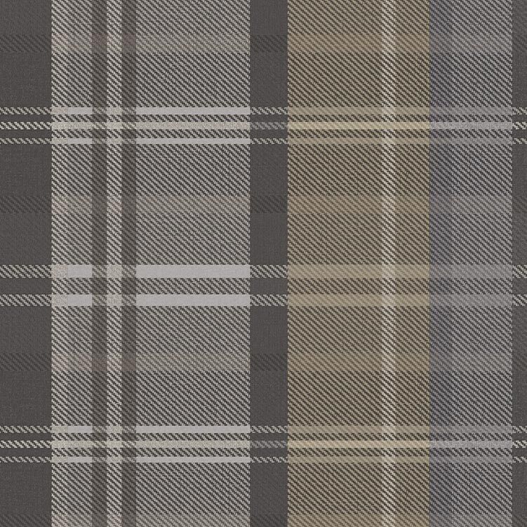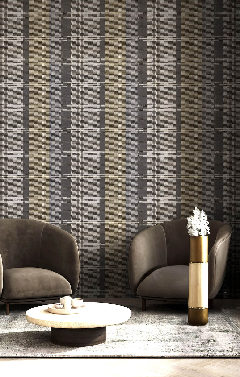 The Scozzese design features a classic plaid pattern with rich etch details in a cross hatching pattern. Bold tonal colours make for a striking wall feature. The Grey & Gold colourway features a plaid design in shades of beige, gold, charcoal grey, and grey.