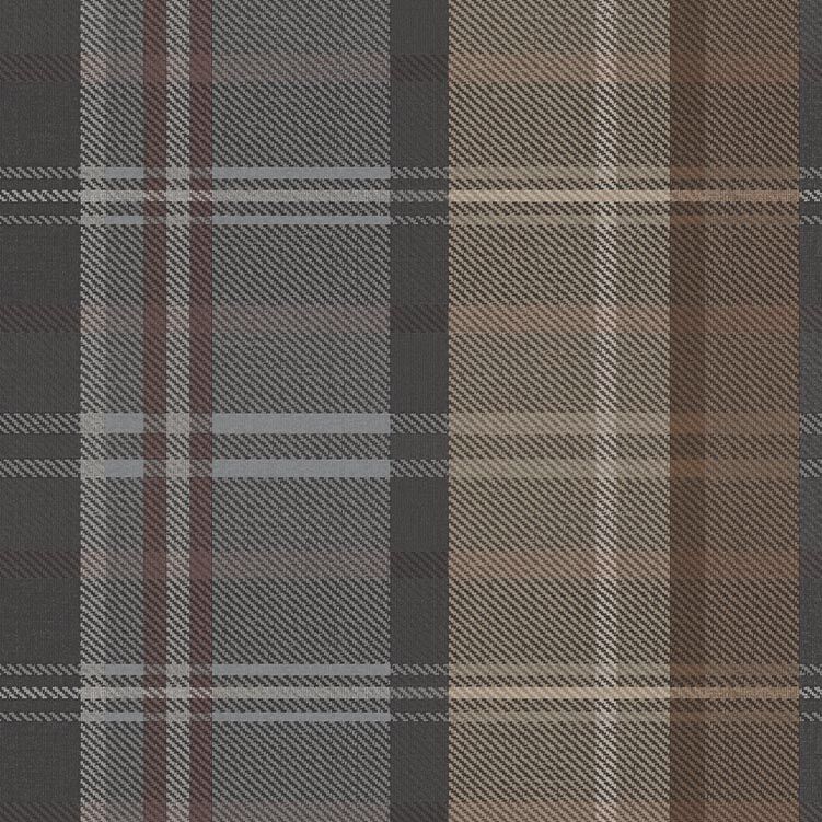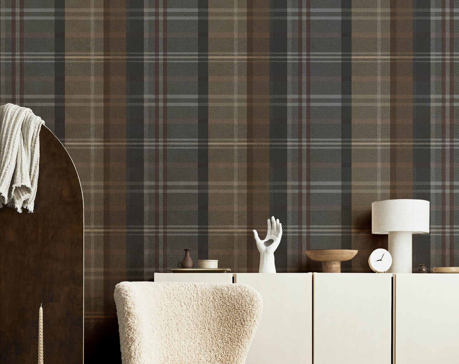The Scozzese design features a classic plaid pattern with rich etch details in a cross hatching pattern. Bold tonal colours make for a striking wall feature. The Grey colourway features a plaid design in shades of grey, charcoal, beige, brown, and red.