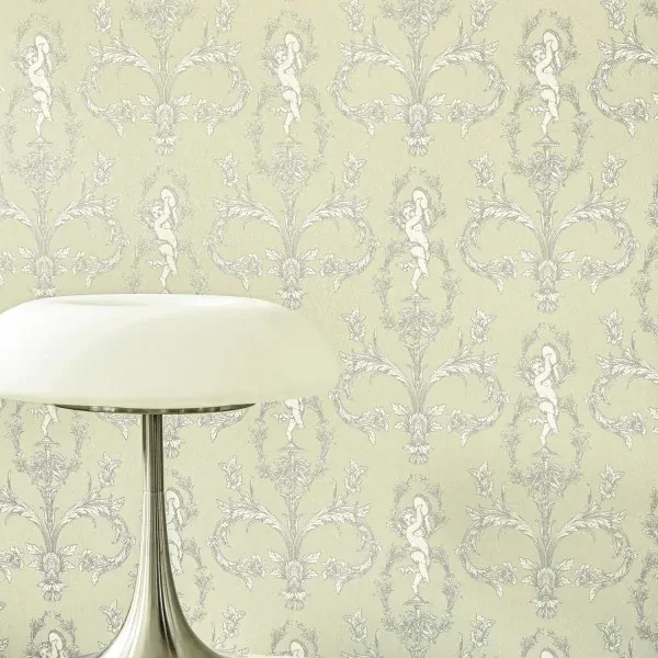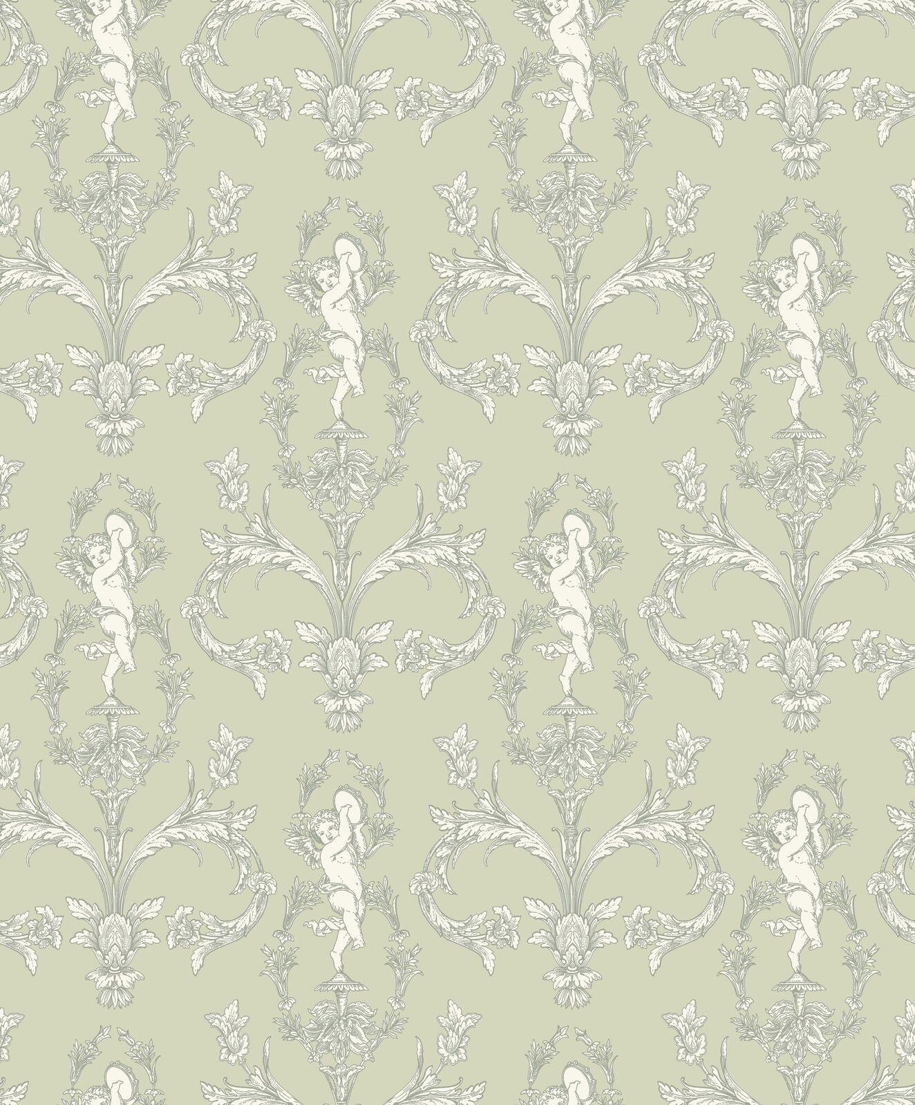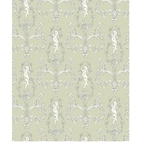 A chorus of cherubs. Absolutely charming, Séraphin features cherubs flying amid a backdrop of floral arabesques. The result is a dynamic yet delicate print. A beautiful masterpiece! The Almond Green colourway features a pale green base with ornate details in white and metallic silver.