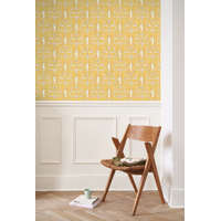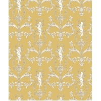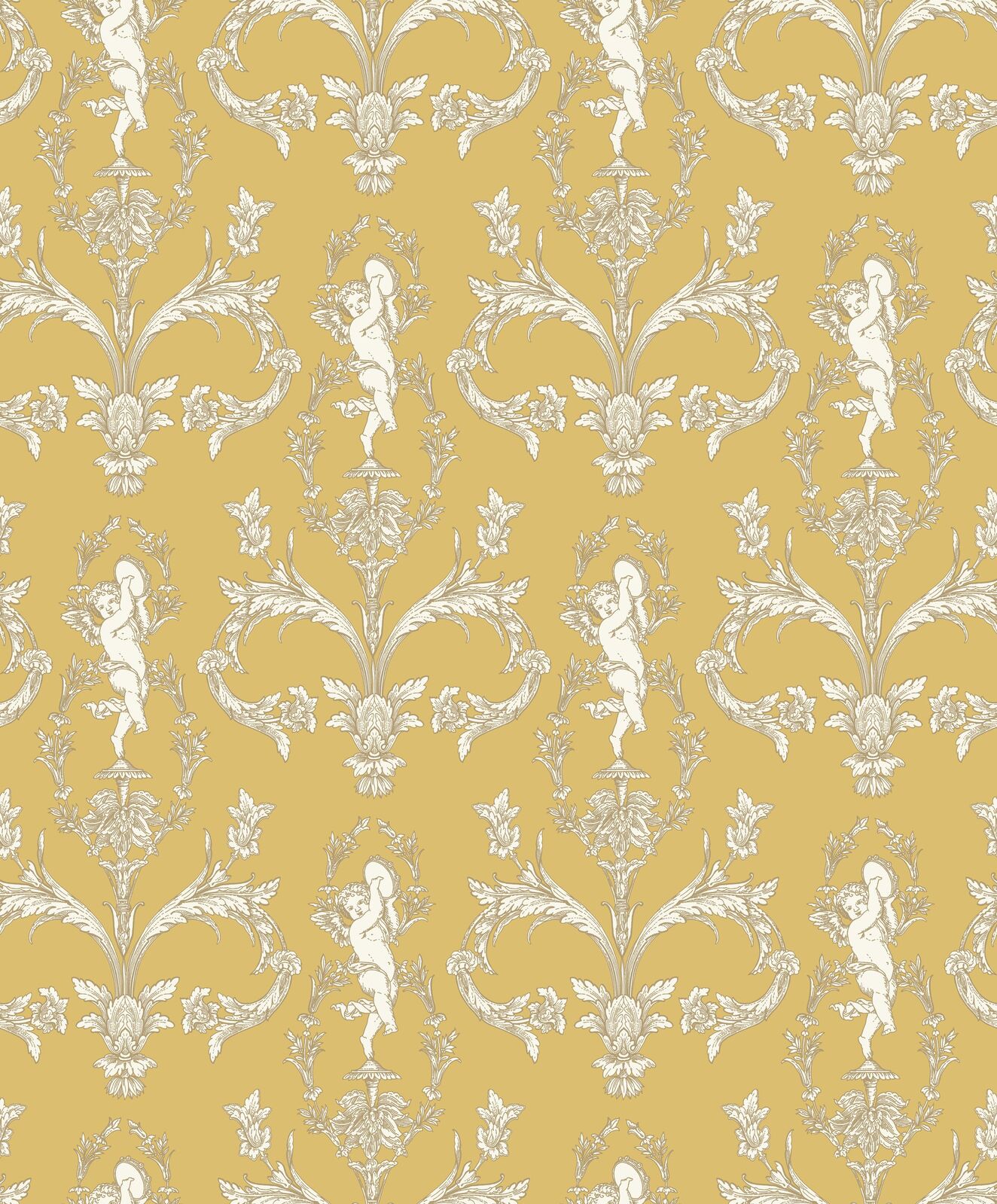 A chorus of cherubs. Absolutely charming, Séraphin features cherubs flying amid a backdrop of floral arabesques. The result is a dynamic yet delicate print. A beautiful masterpiece! The Sunshine Yellow colourway features a rich yellow base with ornate details in white and metallic gold.