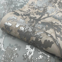 Shimmering Foliage uses a palette of various combined precious metals to turn commonplace trees into a mesmerising mysterious grove. The Spa / Silver colourway features a soft grey-blue shadow background with an organic combination of plain and speckled silver trees over top. The metallic foil creates a raised and textured effect.