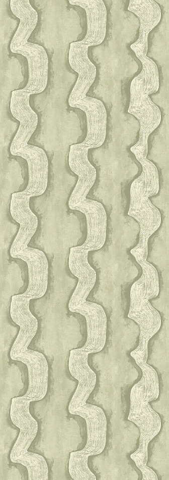 Shodo - Japanese for 'the way of writing'- captures the expressive power of calligraphy in a single, sweeping brushstroke. Broad, dynamic and full of energy, it forms a bold, abstract pattern on the wall. Shodo is a tribute to the strength of handmade expression, vibrant and vital, with a sculptural twist. The Lime colourway features a muted green base with creamy white brushstroke lines overtop and a pearlescent effect all over.