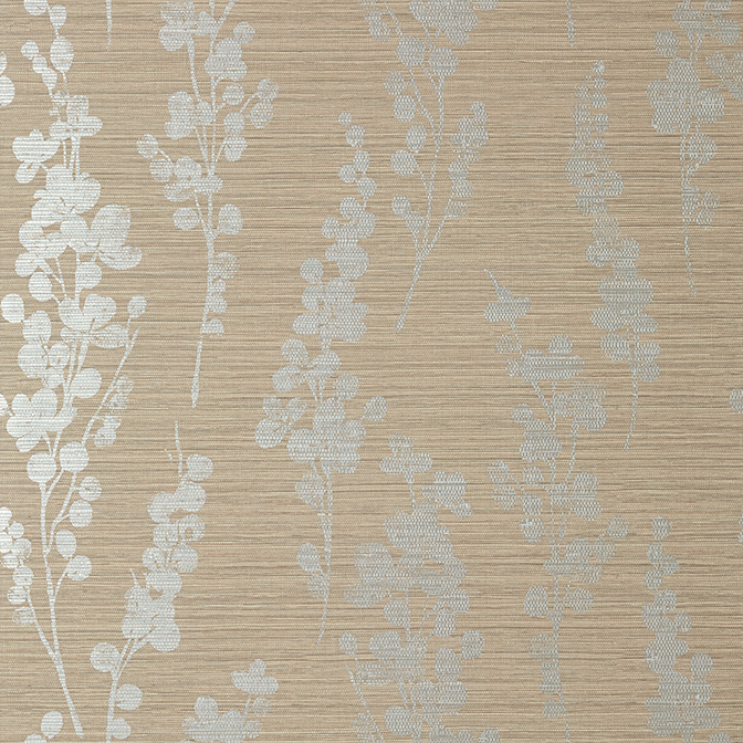 Spring Blooms features a subtle floral pattern of sprigs and berries atop a simulated grasscloth background. The embossed texture gives the look and feel of natural grasscloth while being a performance-grade wallcovering, great for high-traffic rooms. The Metallic Silver on Taupe colourway features a neutral and beige washed cloth-look base with silver foliage over top.
