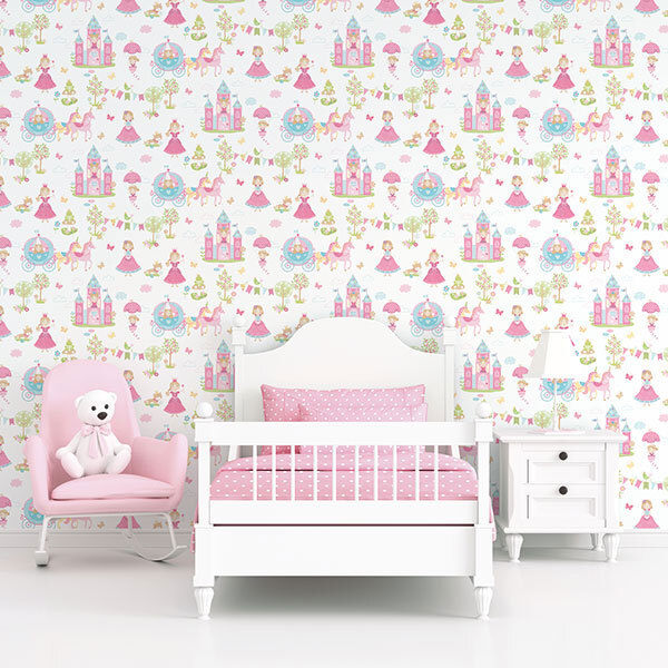 Princess in a castle along with a cinderella horse drawn carriage.  Soft fairytale design wallpaper in grey, pink, and multi colours.