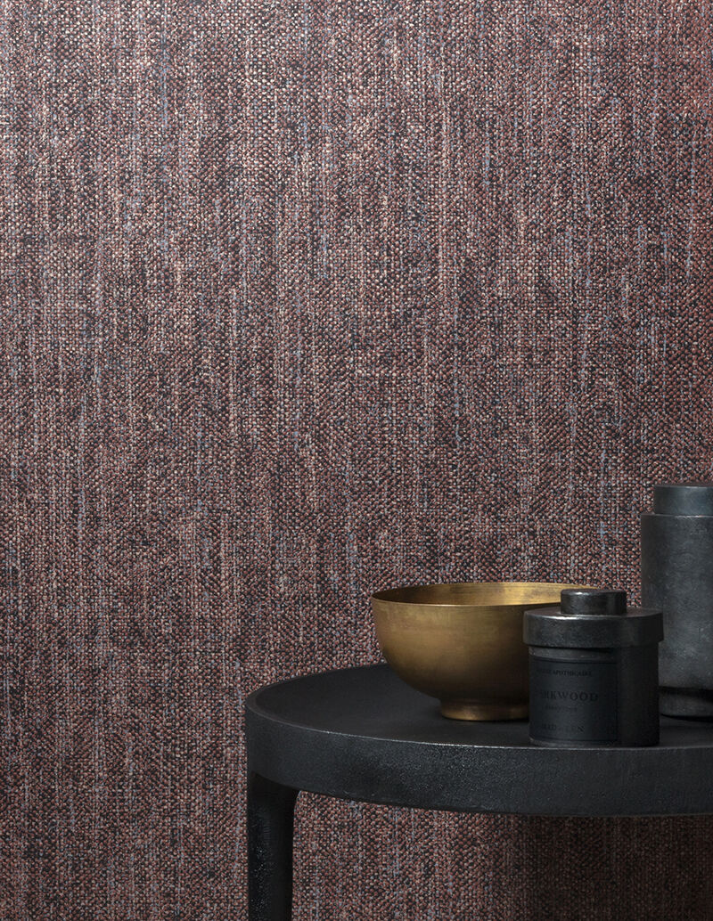 Like a plain fabric texture, Uba combines colour and texture for the ultimate understated wall feature. Washed vertical textures sit under an array of small dots, emulating a traditional fabric texture. The Coconut colourway features a charcoal base with blue and metallic copper textures with matte terracotta dots over top.