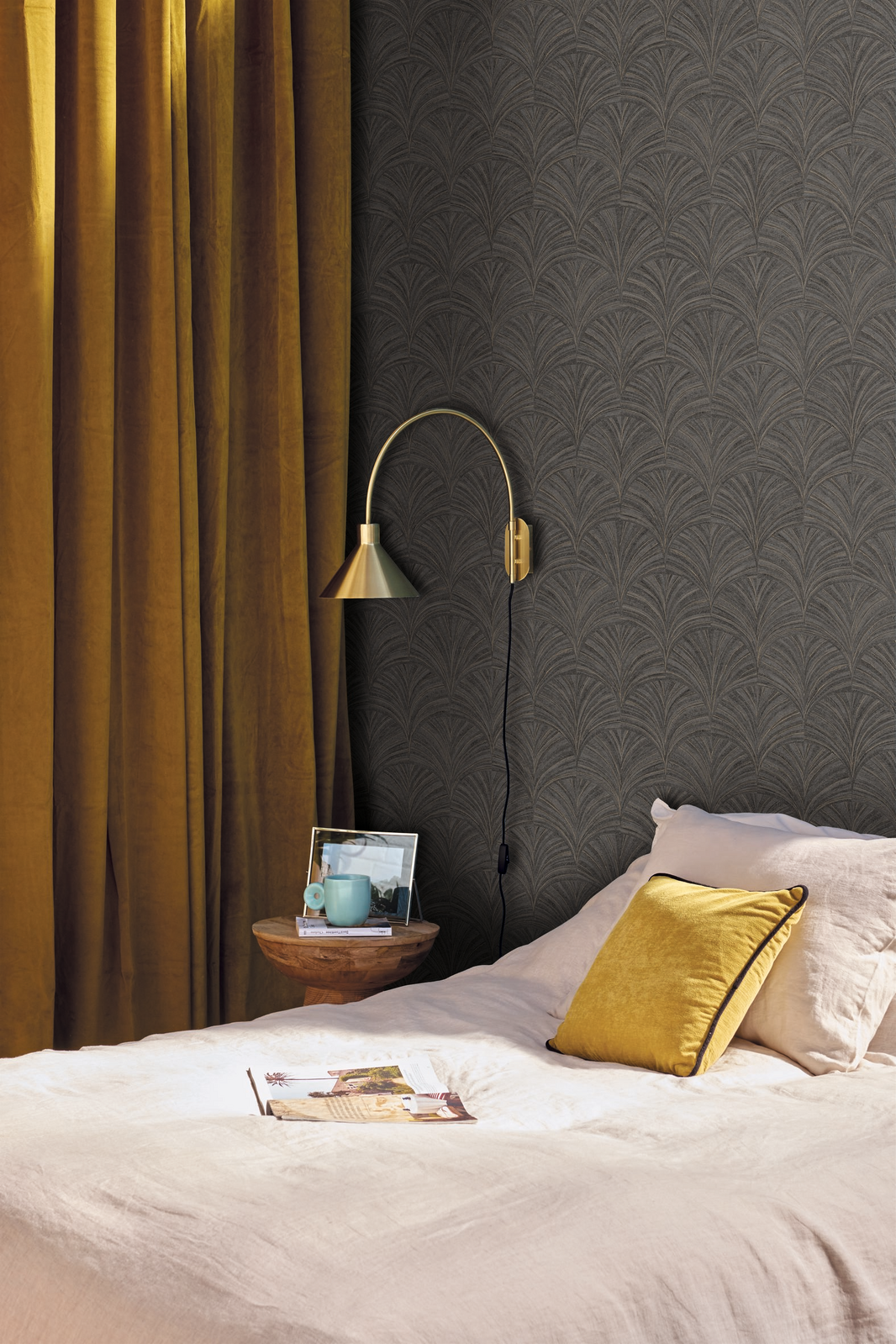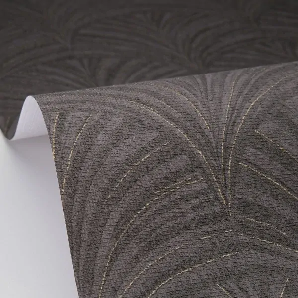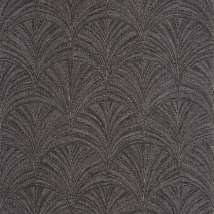 A pretty palmette + a beautiful range of colours = a marquetry-inspired pattern that is very much in vogue this season. We love the new pomegranate colour and the golden effect on some of the designs. The Noir & Gold colourway features geometric fans in two tones of charcoal with contrasting metallic gold threads throughout.