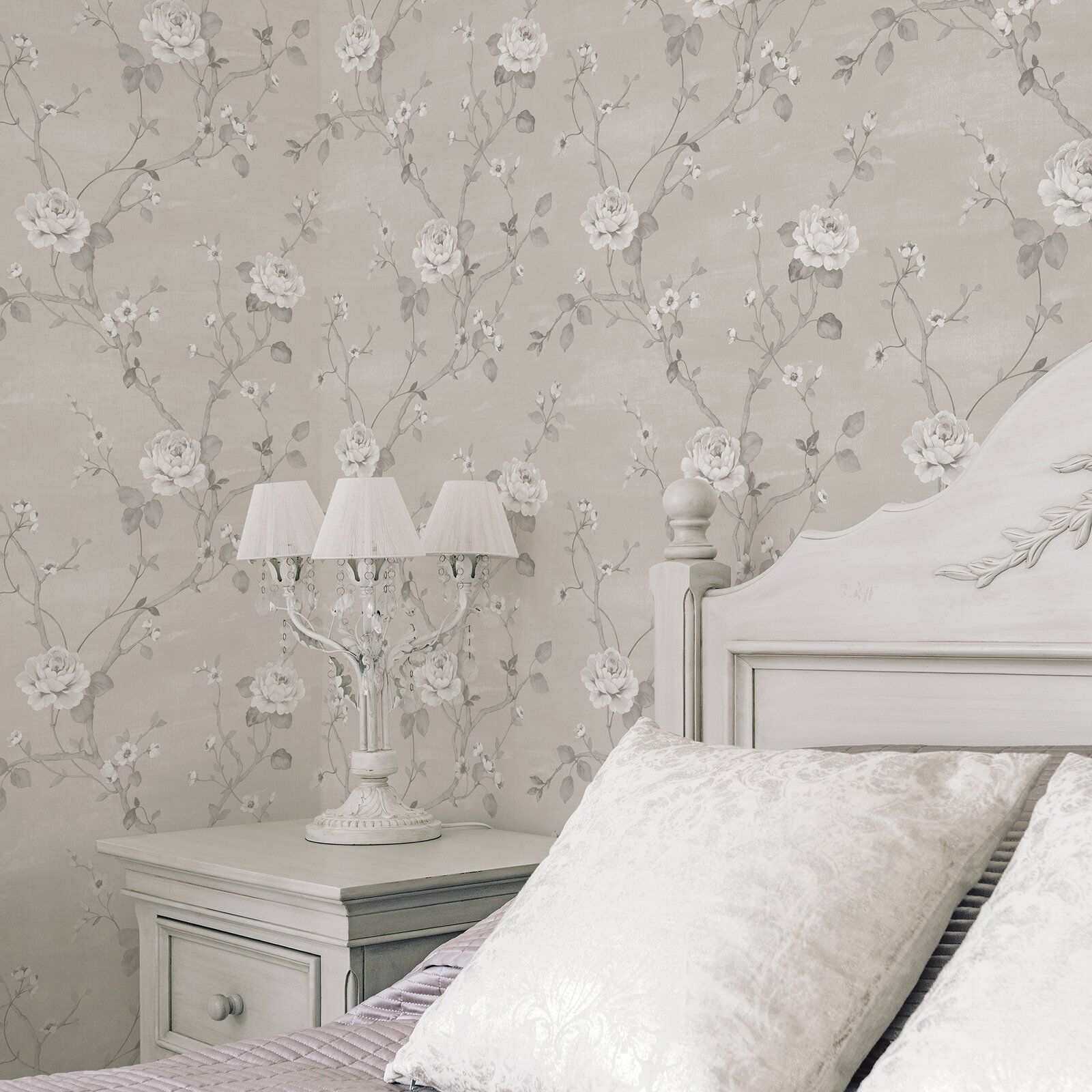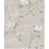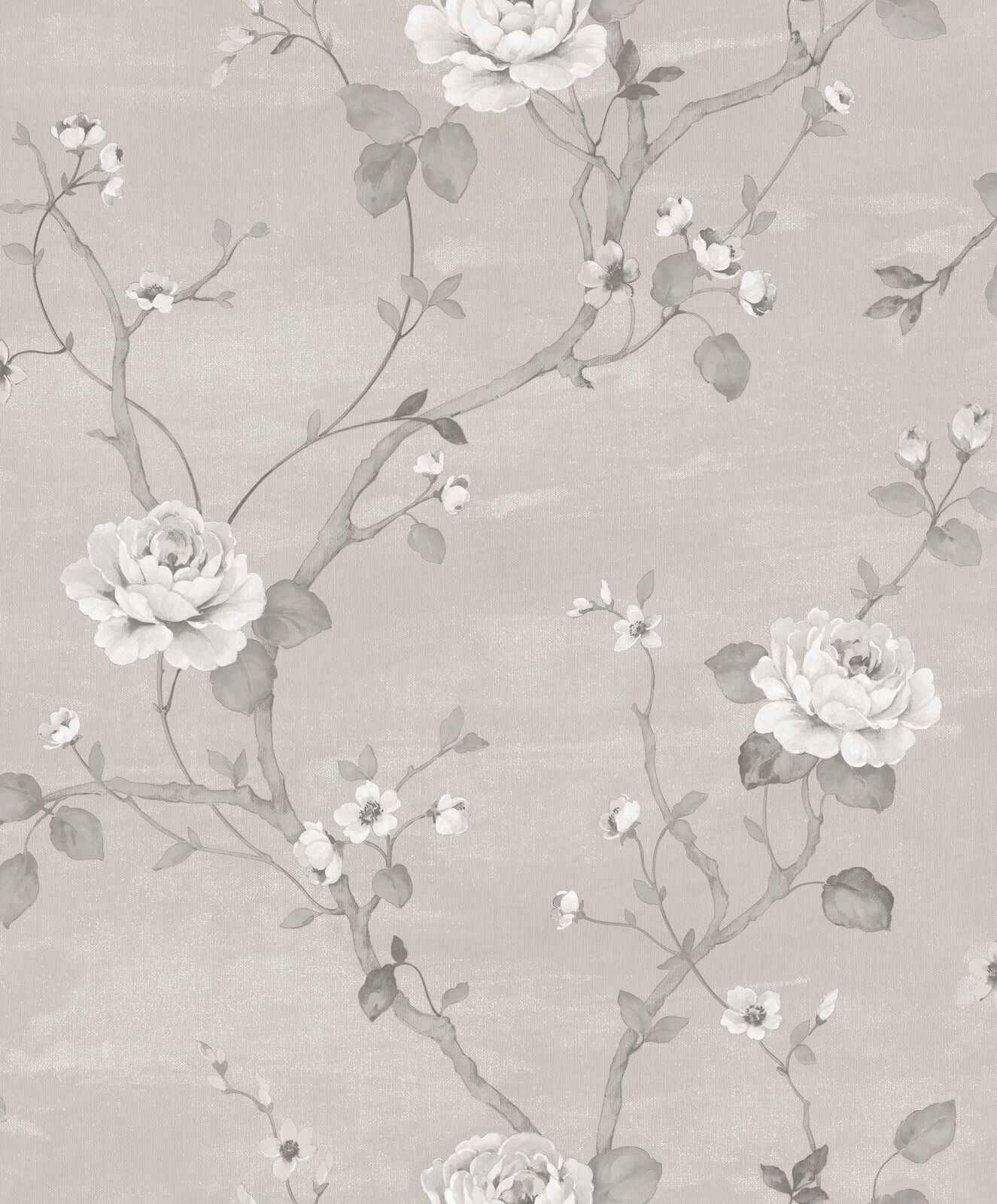 Simple white florals lay delicately among branching foliage. With a rich paint-like embossing and silk effect background, the White Florals design offers luxurious depth. The Grey colourway features a soft grey and silver toned background with grey/white florals and metallic silver leaves.